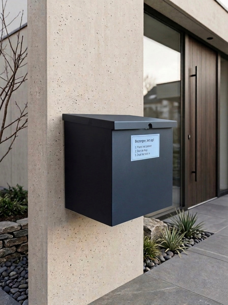 Bezorger opent de bovenklep, plaatst het pakket en sluit eenvoudig af — zonder gedoe.